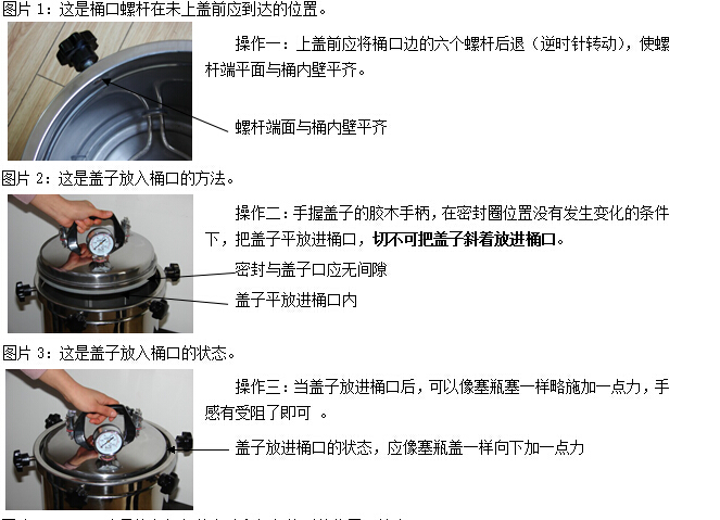 c 適當退出已經擰在滅菌器桶口邊上的膠木螺釘,使螺釘端頭離開器蓋的邊緣,然后小心提起器蓋。切勿使用提拉放汽管的方法提起器蓋。