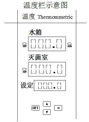 滅菌器雖然分別對(duì)水箱、滅菌室進(jìn)行溫度檢測(cè)、顯示和控制,但溫度只要作一個(gè)設(shè)定就可以了。溫度設(shè)定在溫度欄中進(jìn)行。