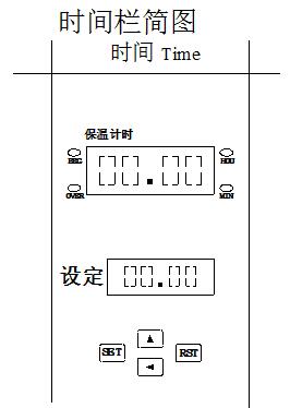 時(shí)間欄里有兩組數(shù)字屏,上面組是計(jì)時(shí)屏,下面組是設(shè)置屏,顯示設(shè)定的時(shí)間值。計(jì)時(shí)屏在溫度沒(méi)有達(dá)到計(jì)時(shí)點(diǎn)不計(jì)時(shí),四個(gè)數(shù)字顯示為“00.00”。時(shí)間屏和設(shè)置屏前兩位為整數(shù),后兩位為小數(shù),中間有小數(shù)點(diǎn)。時(shí)間單位可以設(shè)定為“分鐘”也可以設(shè)定為“小時(shí)”。