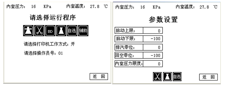 菌過程的溫度、壓力、時間、過程階段、預(yù)置參數(shù)等均在觸摸屏顯示器中自動顯示并可以隨時儲存,并配有微型打印機進行打印工作過程參數(shù)以便于歸檔、備查。此外,該控制系統(tǒng)配備有一套完整的自測及校正程序,可以實現(xiàn)不同海拔高度下、不同地區(qū)的壓力、溫度等參數(shù)的校正;還具有多級控制保護、幫助功能。