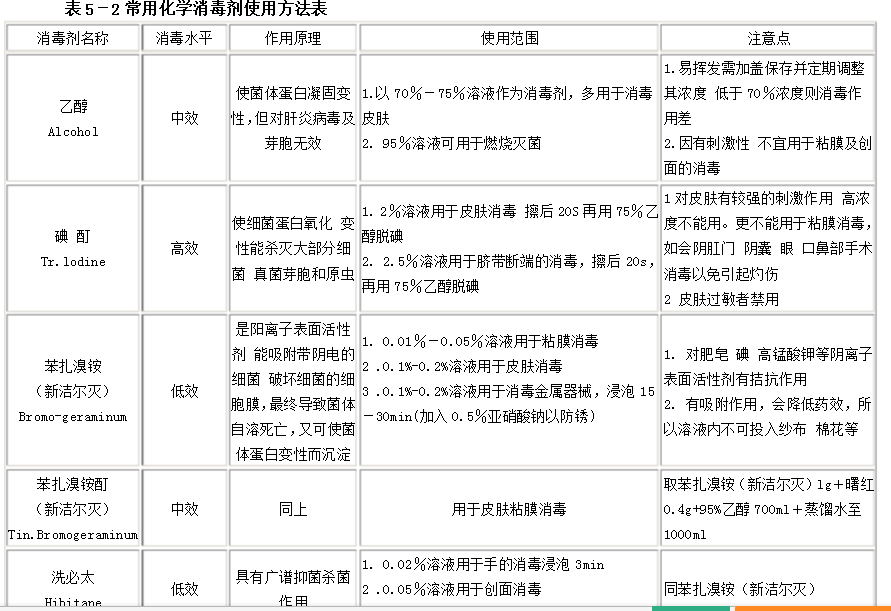(2)中等水平消毒劑其特點(diǎn)是溶解度好、性質(zhì)穩(wěn)定、能長期貯存,但不能作滅菌劑。如碘伏、碘酒、乙醇、煤酚皂、高錳酸鉀等。